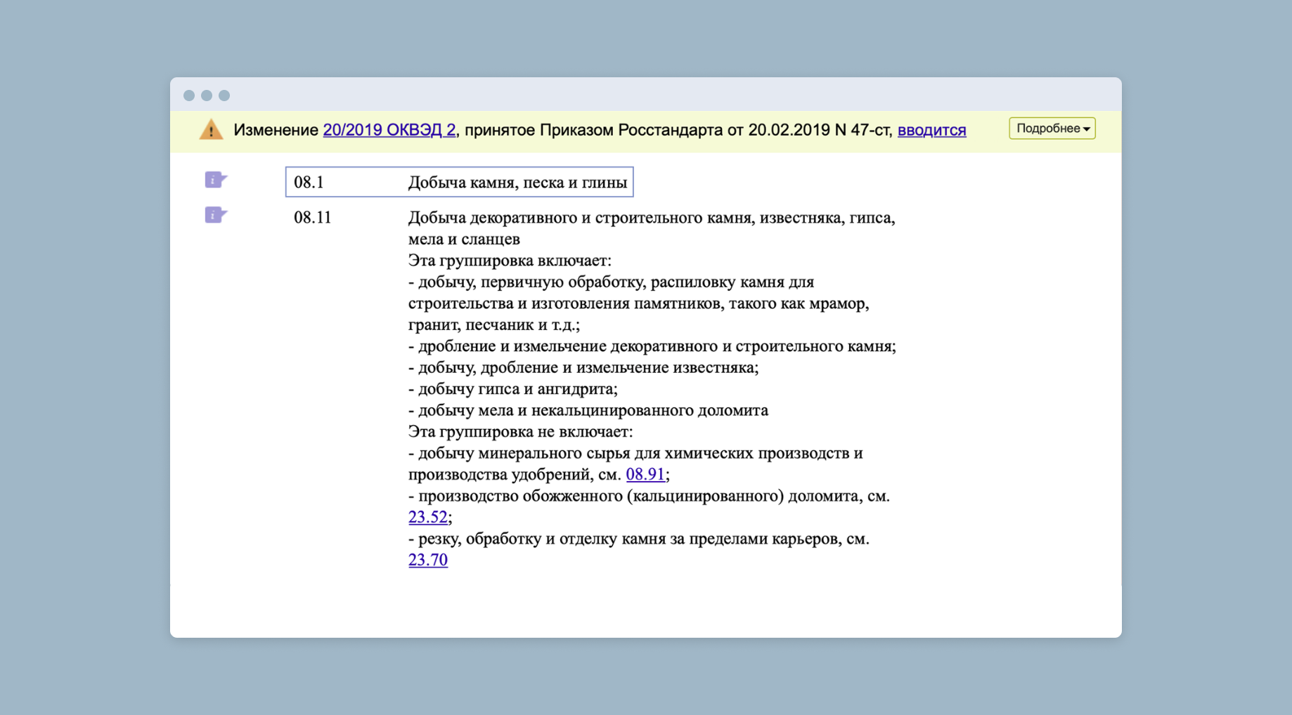 Зайдите в классификатор и найдите нужный вам код. Добавлять можно только те коды, которые имеют не меньше четырёх цифр. Например, нельзя выбрать код 08.1 — добыча камня, песка и глины. Придётся искать в перечне и указывать, какой конкретно камень вы добываете: строительный, гипсовый или какой-то иной. Если несколько, то в ваш список должны попасть все подходящие ОКВЭД.
