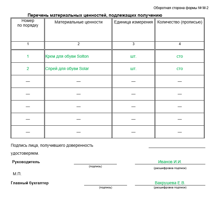 Образец доверенности на получение ТМЦ по форме М-2 (оборотная сторона)
