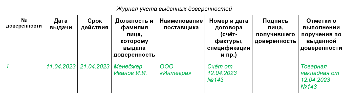 В журнале доверенности присваивают номер, а представитель расписывается в её получении. Не позднее следующего дня после получения ТМЦ он должен представить в бухгалтерию документы на груз (накладную, счёт-фактуру и т. д.).