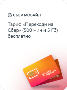«СберМобайл», Услуги оказывает оператор связи ООО «Сбербанк-Телеком», ОГРН 1167746305430, адрес: 117997, г. Москва, ул. Вавилова, д. 19. В рамках предложения на выбор предоставляется бесплатно 500 минут и 5 Гб интернета в тарифе «Переходи на Сбер» или скидка 40% на абонентскую плату на других тарифах. Условия предоставления пакета «Переходи на Сбер»