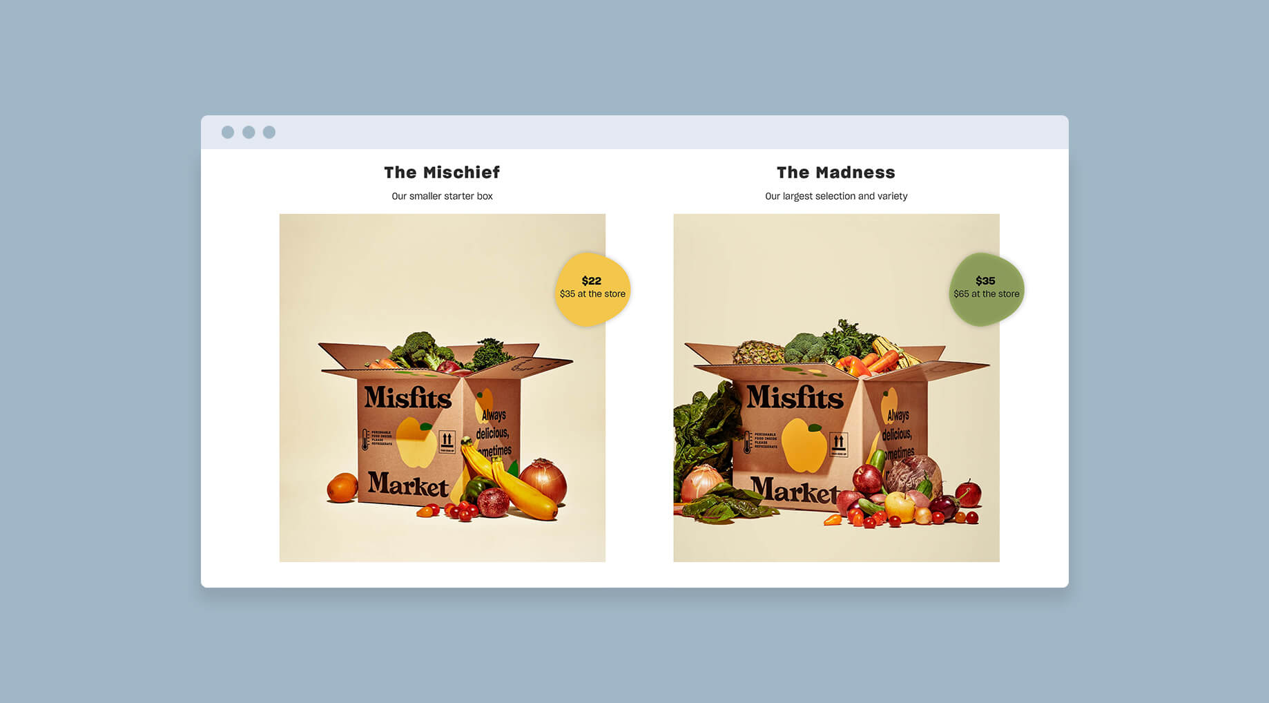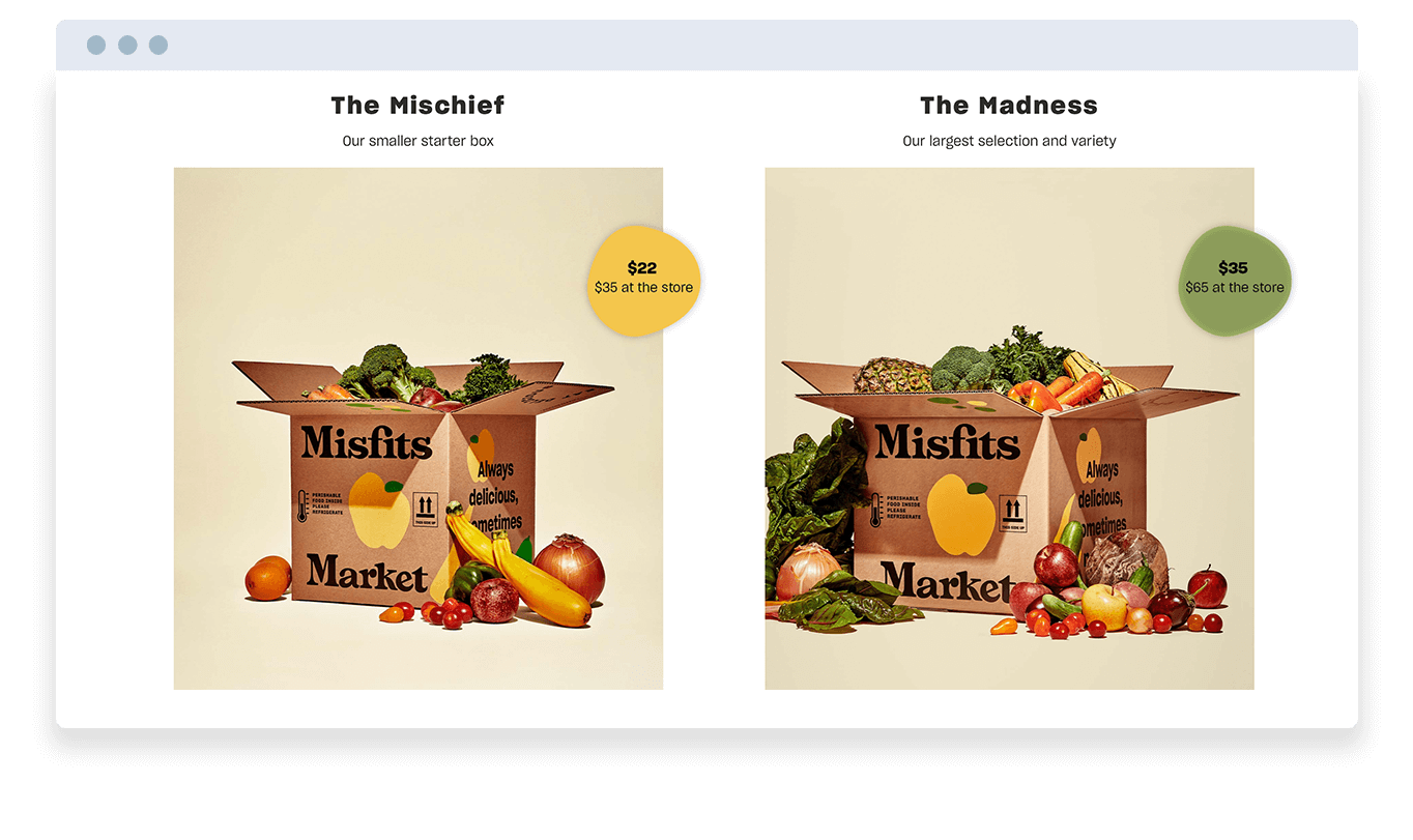 Сервис электронной коммерции Misfits Market предлагает купить со скидками до 40% фрукты и овощи, которые не подходят под стандарты офлайн-магазинов. Товар, который из-за внешнего вида не будет привлекать внимание на полках в супермаркетах, фермеры обычно выбрасывают. Misfits Market его выкупает, сортирует в коробки и доставляет по нескольким штатам. Сервис предлагает не просто купить здоровую еду, а оформить подписку, выбрав частоту доставки.