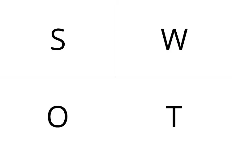 S — ключевые преимущества, сильные места (Strengths). W — наиболее слабые, уязвимые точки (Weaknesses). O — потенциальные возможности (Opportunities). T — вероятные риски (Threats).