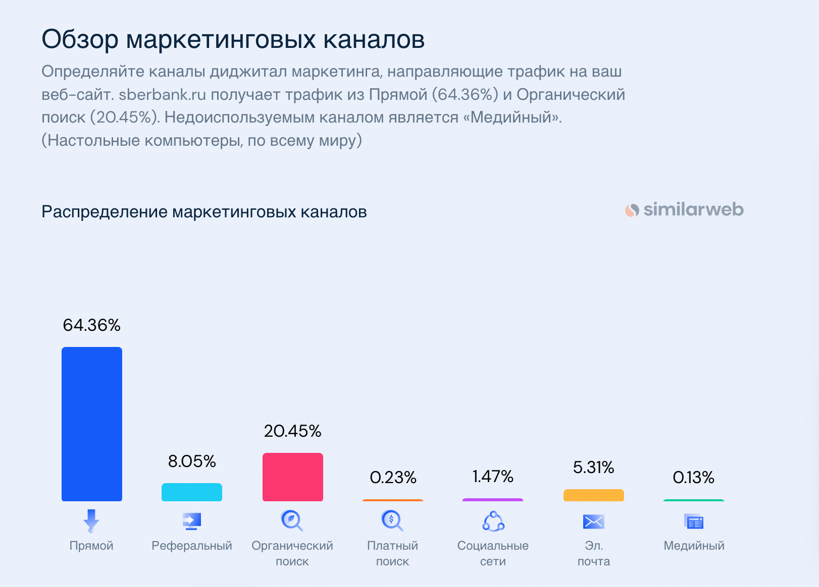 Посмотрели на similarweb данные о сайте Сбера — больше всего посетителей приходит на сайт по прямому трафику