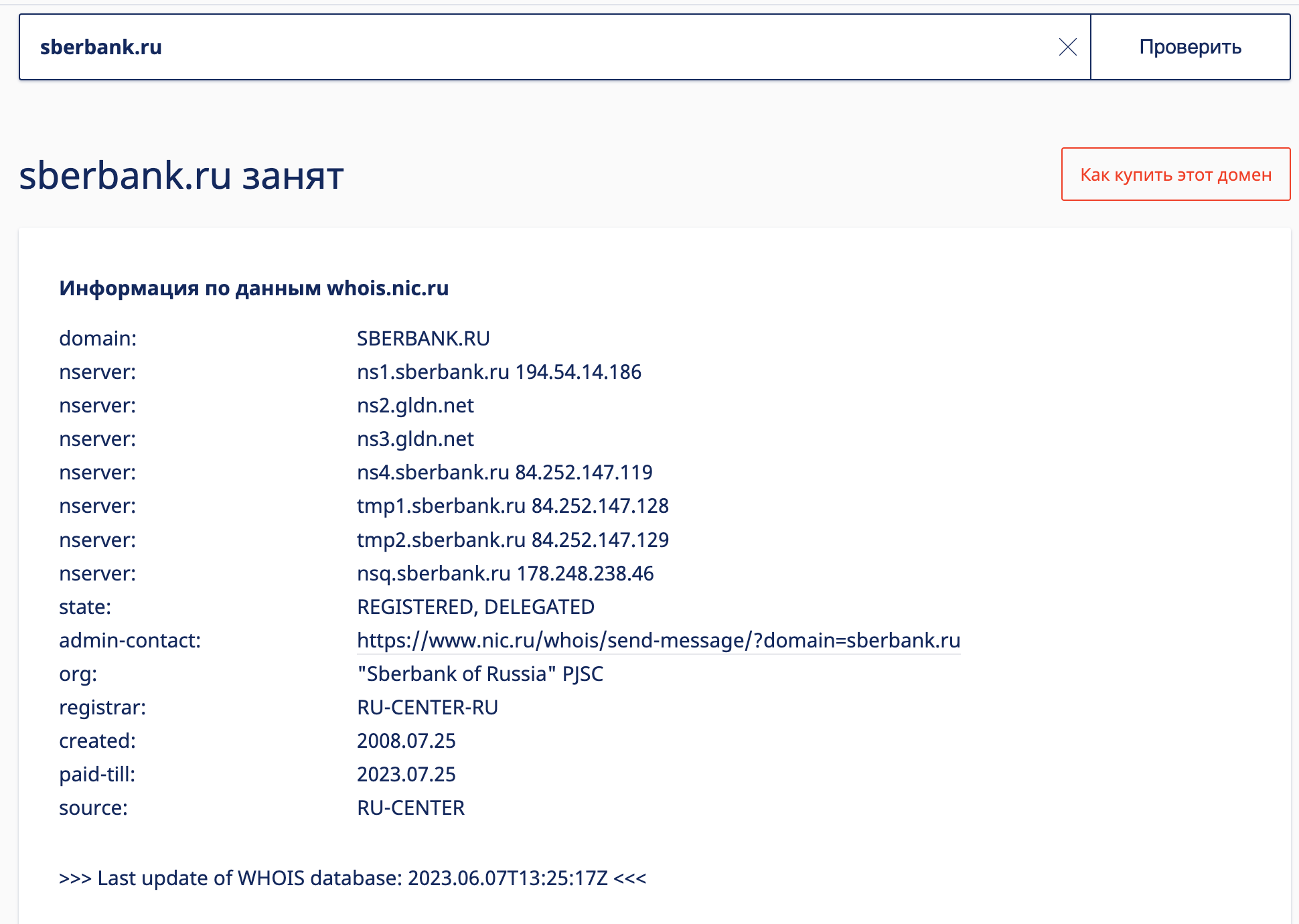 Мы посмотрели данные о домене sberbank.ru — он зарегистрирован 25.07.2008 года