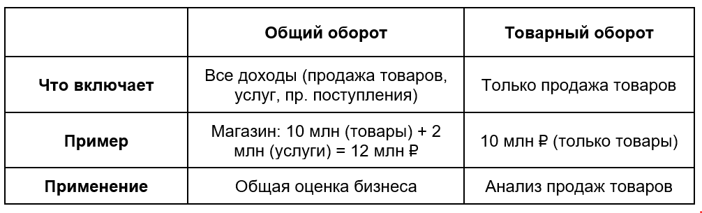 🛒 Разница между общим и товарным оборотом такова: общий оборот охватывает все финансовые операции компании, а товарный — только продажу товаров. Если бизнес не оказывает услуг, эти показатели совпадают.