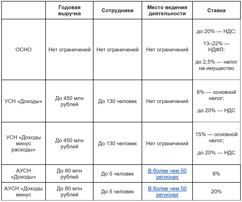 Есть шесть основных систем (режимов) налогообложения: одна общая (ОСНО) и пять специальных: УСН — упрощённая система налогообложения, АУСН — автоматизированная упрощённая система налогообложения, ПСН — патентная система налогообложения, НПД — налог на профессиональный доход и ЕСХН — единый сельскохозяйственный налог. При выборе нужно учитывать форму ведения бизнеса и сферу деятельности, примерную сумму налогов, сложность отчётности и региональные особенности специальных режимов.