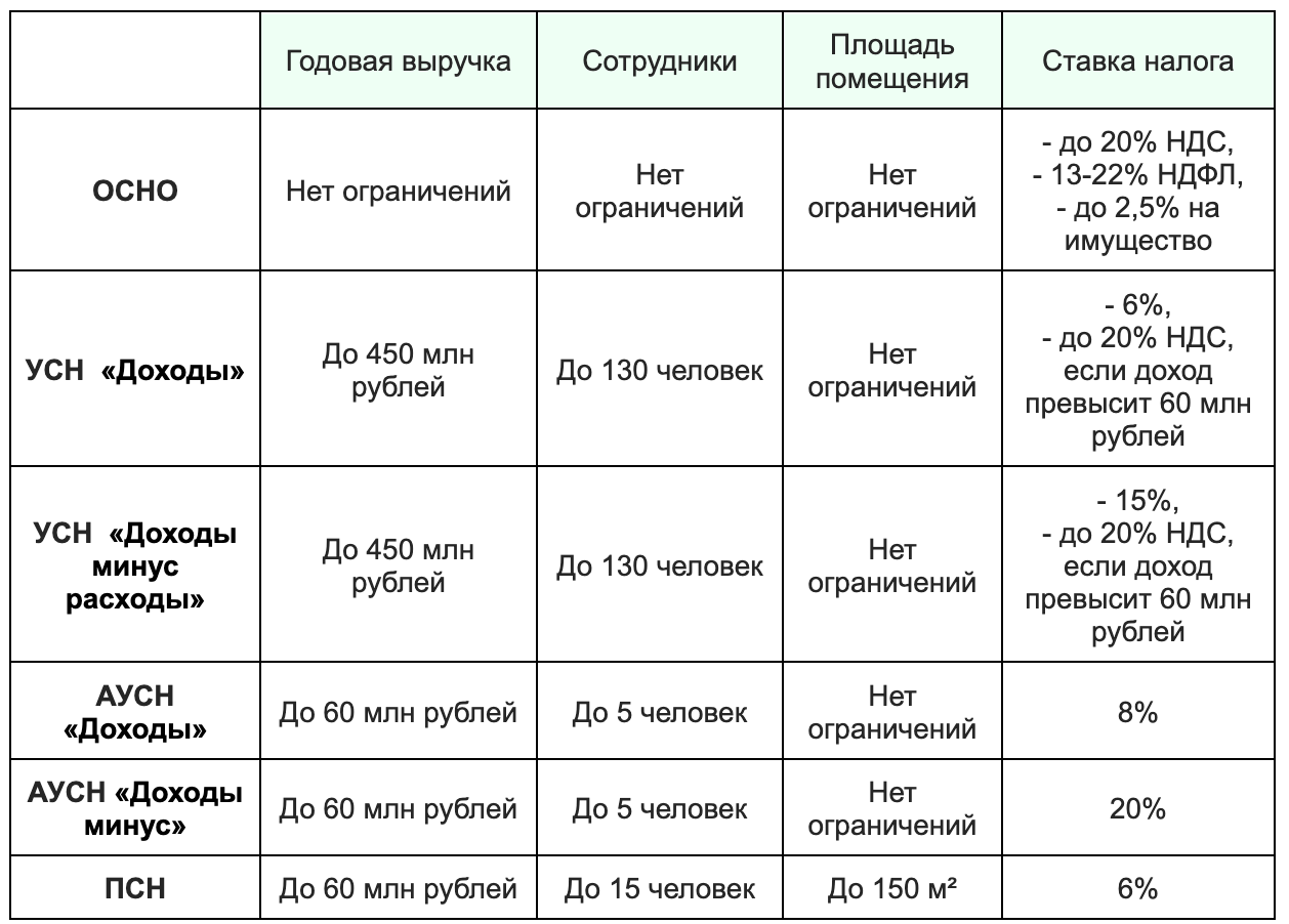 Сейчас есть пять основных систем (режимов) налогообложения: одна общая (ОСН) и четыре специальных: УСН — упрощённая система налогообложения, АУСН — автоматизированная упрощённая система налогообложения, ПСН — патентная система налогообложения, ЕСХН — единый сельскохозяйственный налог. Последний подходит только для производителей сельхозтоваров.