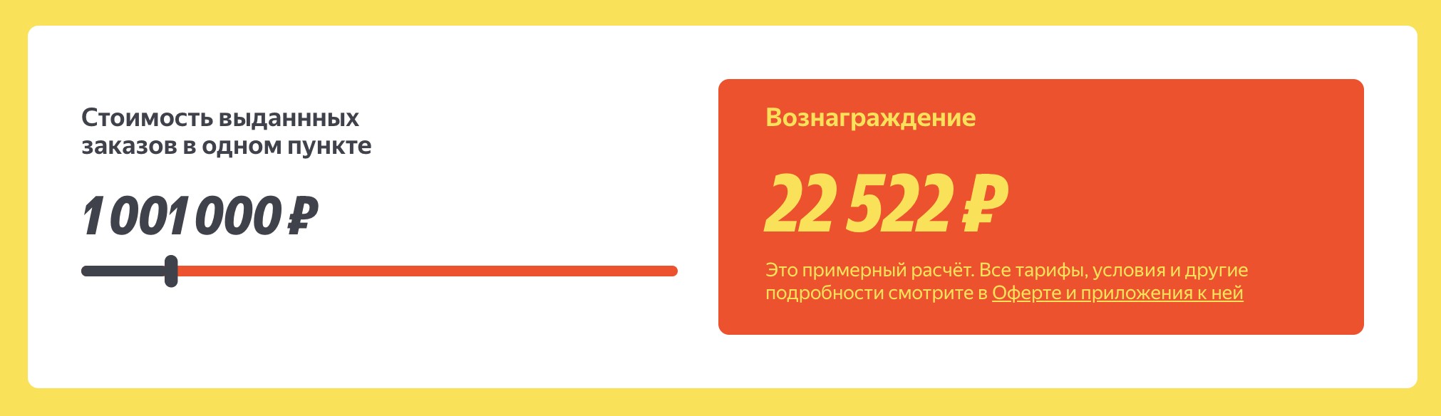 Доход небрендированного ПВЗ — 2,25% от выданных заказов. К примеру, с заказов стоимостью 1 000 000 рублей вы получите 22 500 рублей.