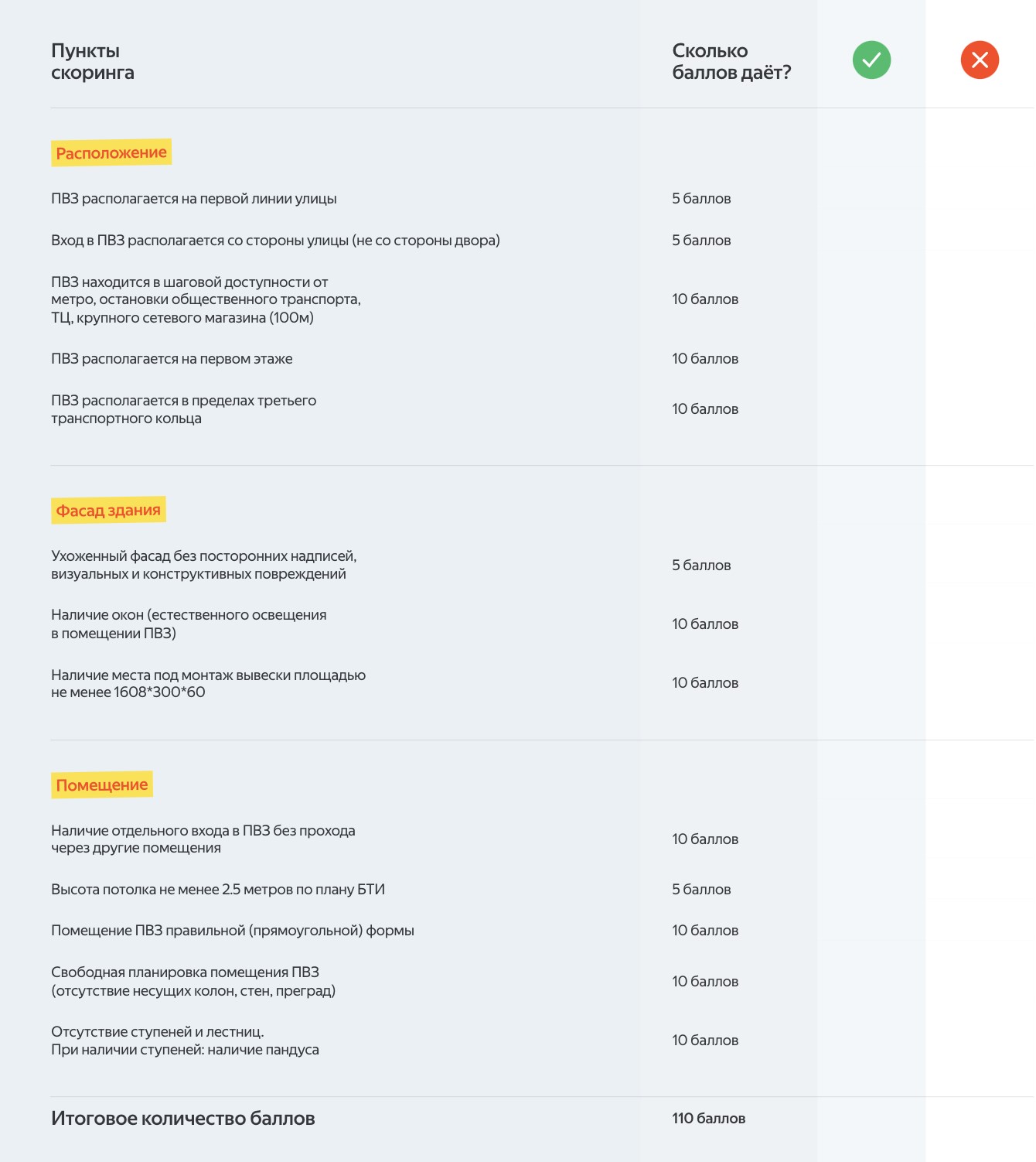 Также нужно проверить, соответствует ли ваше помещение критериям из специального чек-листа на сайте Яндекс Маркета: если набирается 65 баллов и больше, то помещение можно использовать. Например, за наличие пандуса дают 10 баллов, а за ухоженный фасад — 5 баллов.