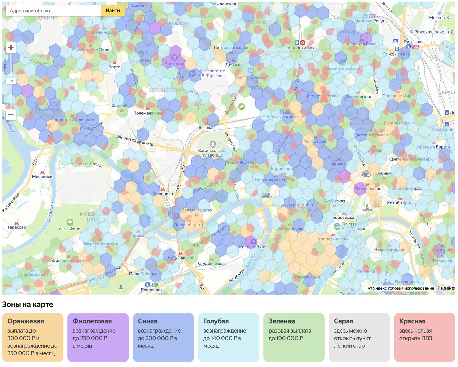 В первые месяцы работы некоторые маркетплейсы помогают новым партнёрам и выплачивают вознаграждения. Яндекс Маркет в их числе. В зависимости от зоны, в которой вы открыли ПВЗ, вы можете получить разовую или до 6 ежемесячных выплат. Зоны можно посмотреть на специальной карте — они выделяются шестиугольниками и различаются по цветам. Так, если вы откроете ПВЗ в зелёной зоне, то можете получить до 100 000 рублей единовременно, а если в оранжевой — до 300 000 рублей единовременно и до 250 000 рублей ежемесячно.
