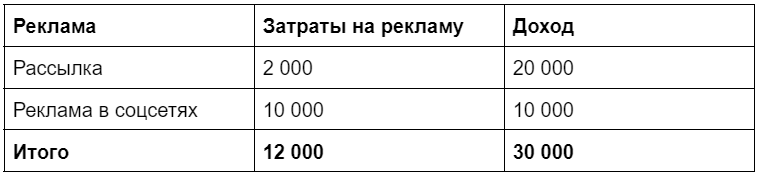 ROAS рассылки = 20 000 / 2 000 х 100% = 1000% — каждый потраченный на рассылку рубль принёс 10 рублей.