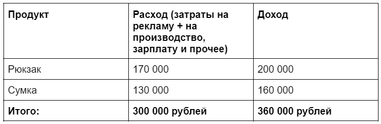 Предположим, ИП шьёт на заказ рюкзаки и сумки. Свою продукцию он продвигает в соцсетях и с помощью рассылок по базе клиентов. Ему нужно подвести итоги за месяц работы.