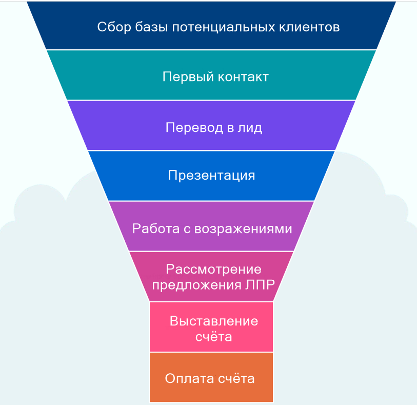 В обобщённом виде воронку B2B-продаж можно представить следующим образом.