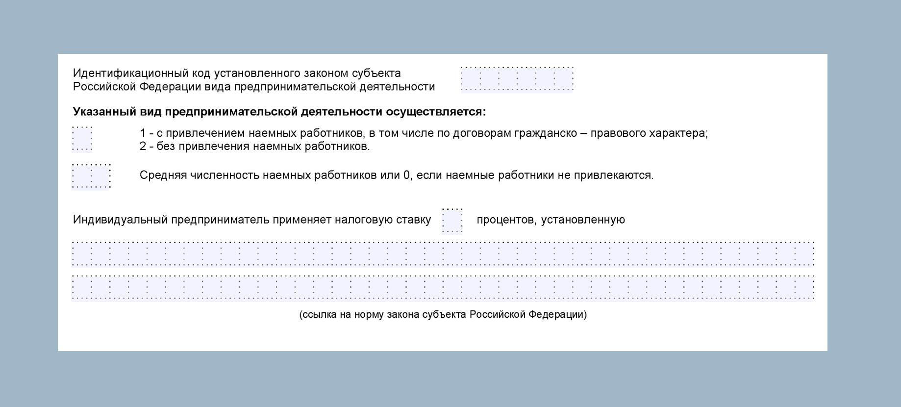 Для действующих ИП. Если вы уже получили 1 патент, то воспользоваться налоговыми каникулами получится только при получении следующего в течение его срока действия — для этого подайте заявление на патент с нулевой ставкой, сославшись в форме на региональный закон (см. образец выше).