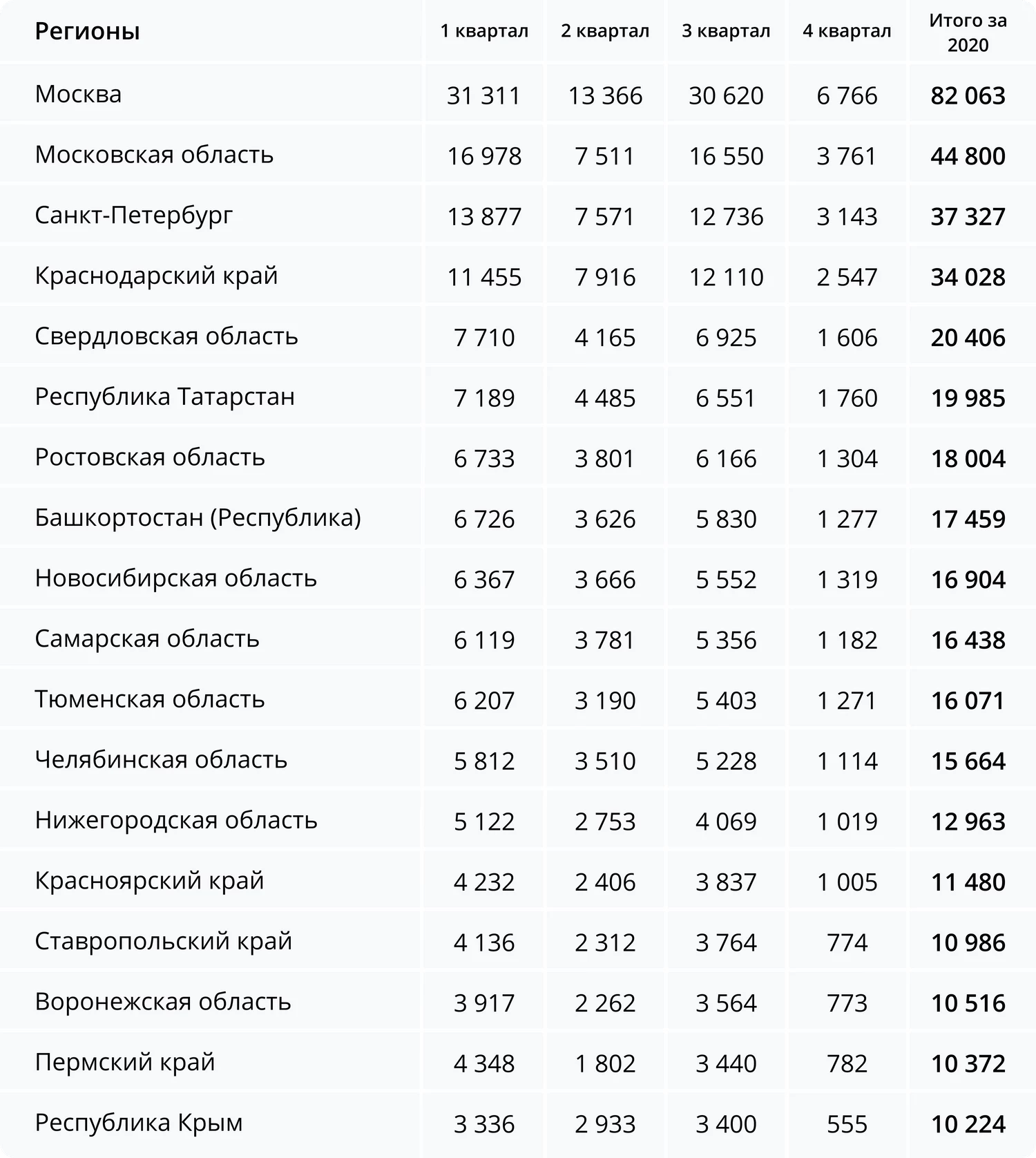 В Москве и Санкт-Петербурге предпринимательская активность выше. На столицу по итогам неполных четырёх кварталов пришлось около 82 000 регистрации, на Московскую область — почти 45 000, а на Петербург порядка 37 000. Следом за ними в порядке убывания идут: Краснодарский край, Свердловская область, Татарстан и Ростовская область.