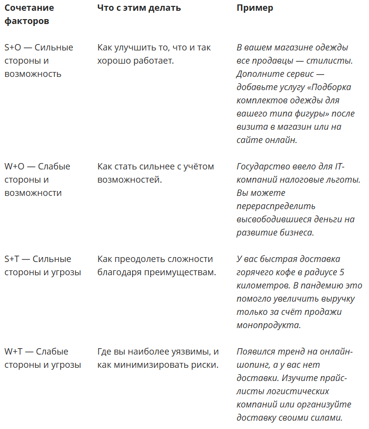 O+T ⠀Возможности и угрозы зависят от внешних факторов, которые невозможно контролировать.