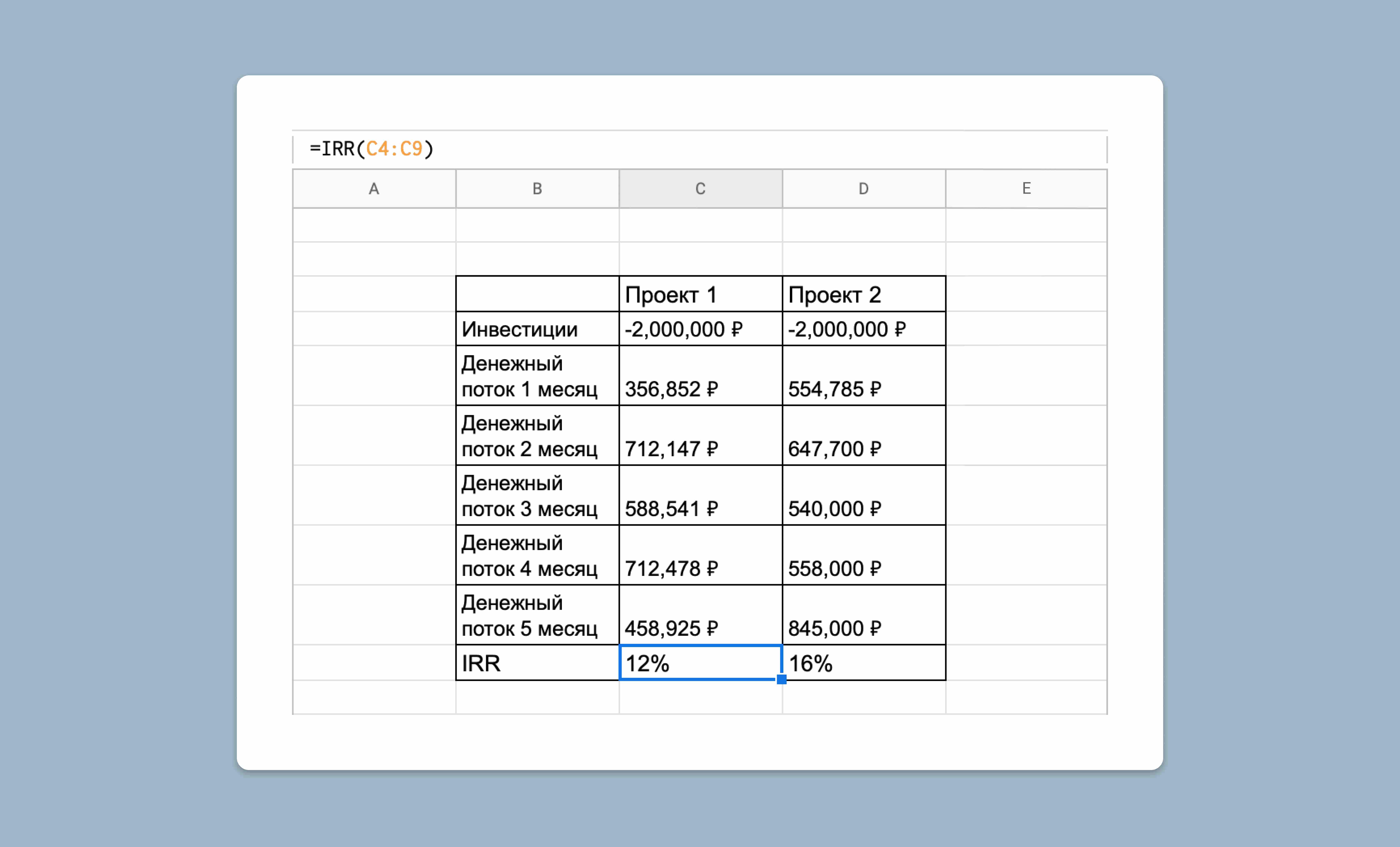 Вот пример расчёта для сравнения двух инвестиционных проектов с одинаковыми вложениями: