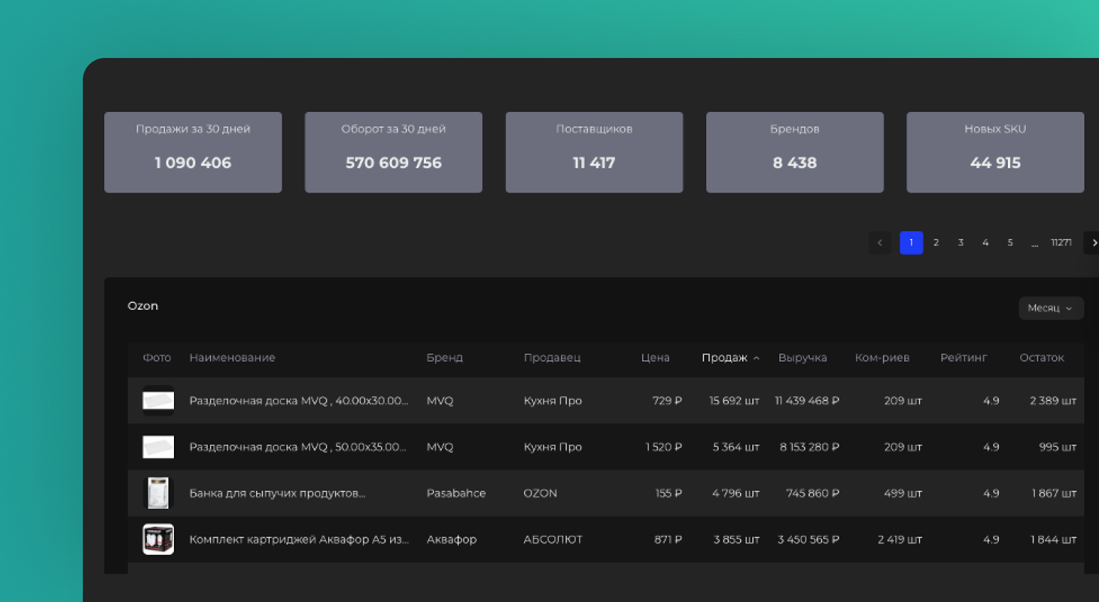 Например, вы видите, что в товарах для дома и сада в подкатегории «посуда» самым популярным товаром за последний месяц стала разделочная доска. Если зайти в карточку товара, можно найти ещё больше информации: среднее число продаж за последний месяц, количество отзывов, выручку и динамику продаж.