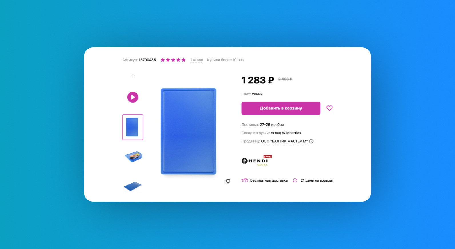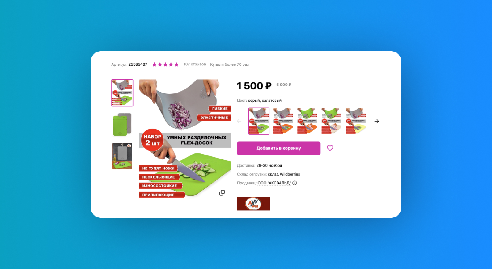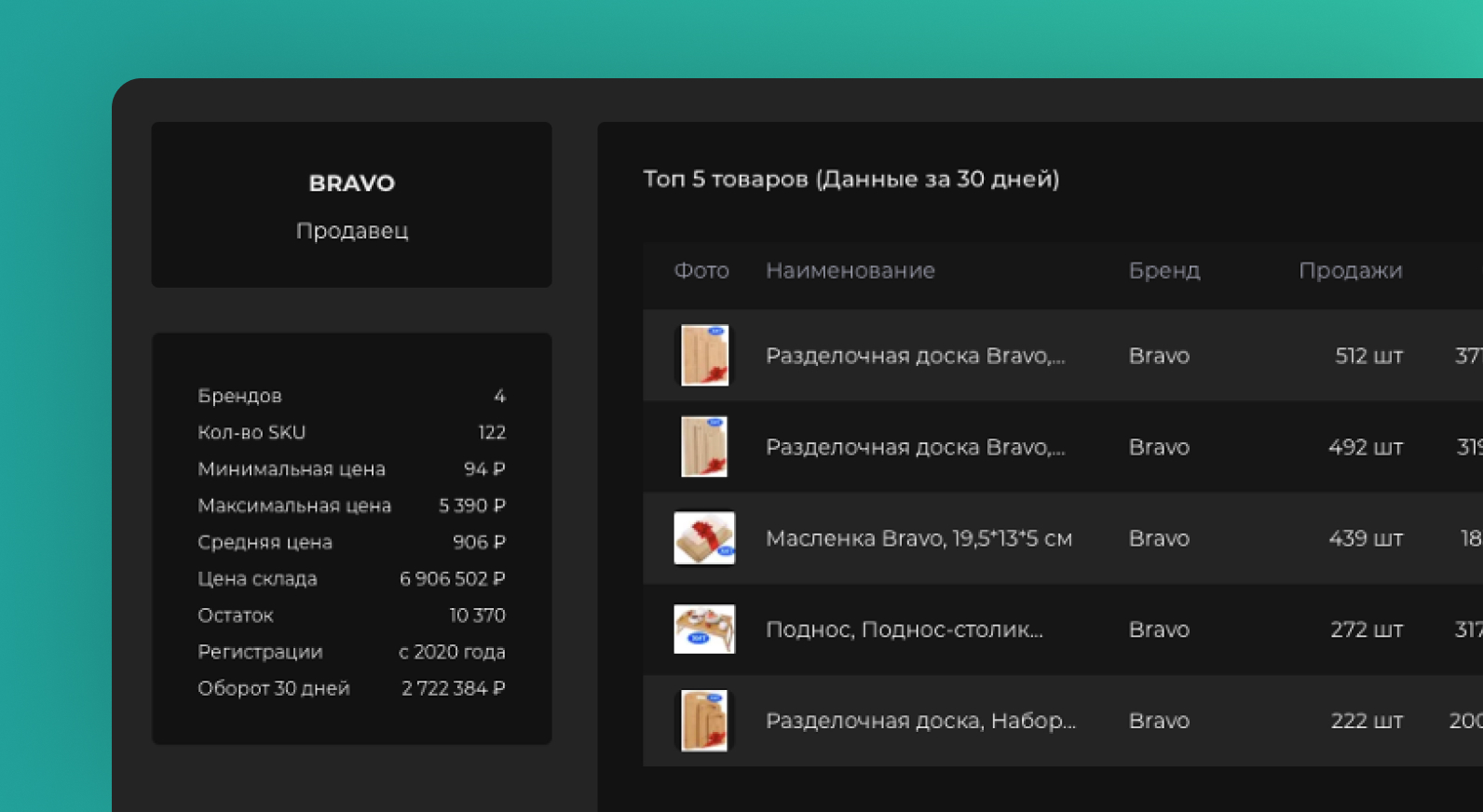 Карточка продавца разделочных досок с ценой, количеством товара и оборотом за последний месяц. Источник: ShopStat