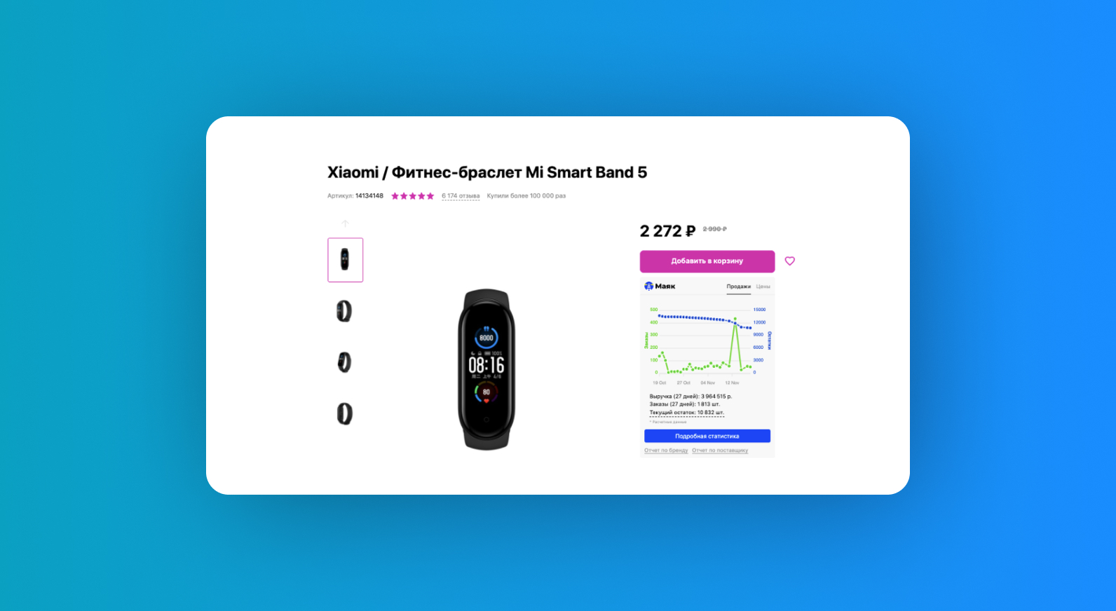 Виджет рядом с карточкой товара показывает данные по продажам фитнес-браслета. Источник: Wildberries