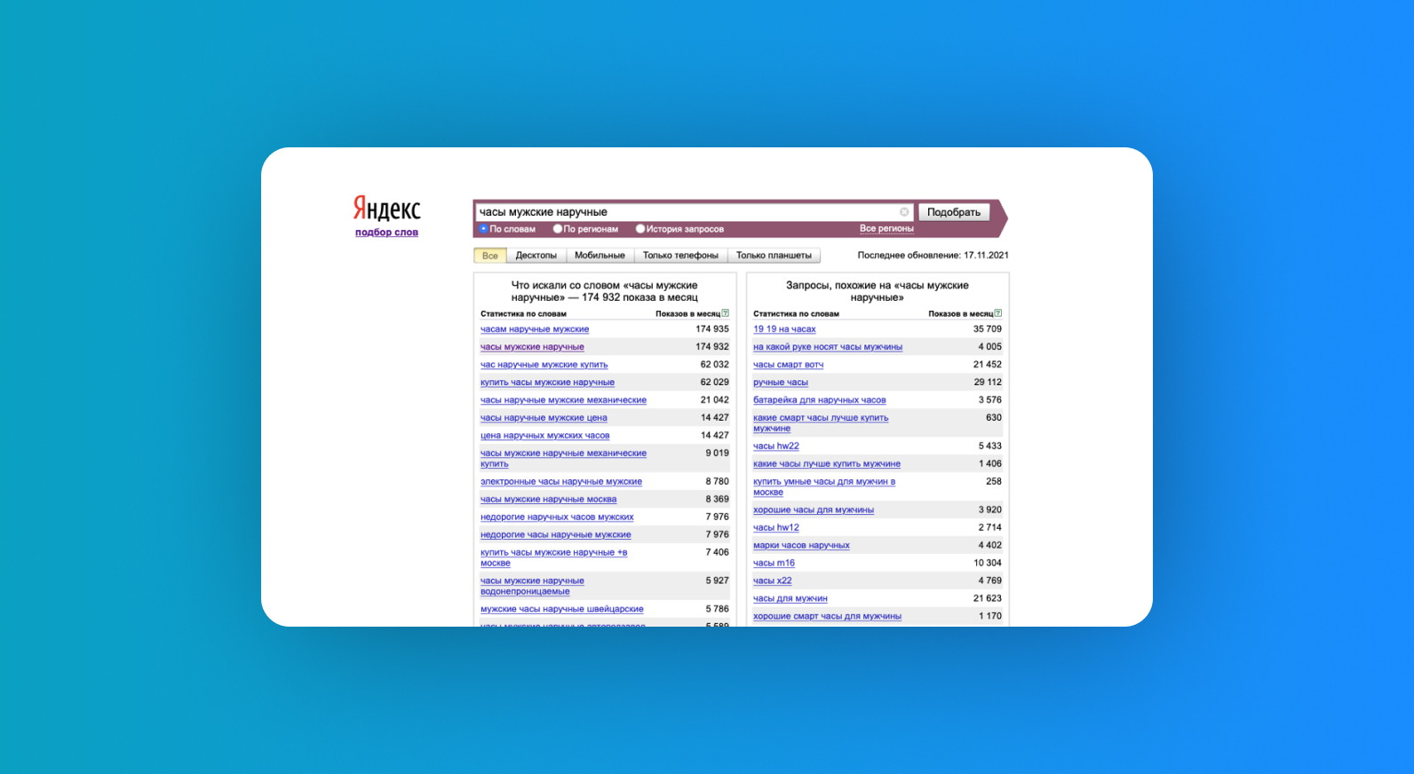 В ноябре 2021 года «наручные часы» искали более 500 тысяч раз. Источник: Яндекс.Wordstat
