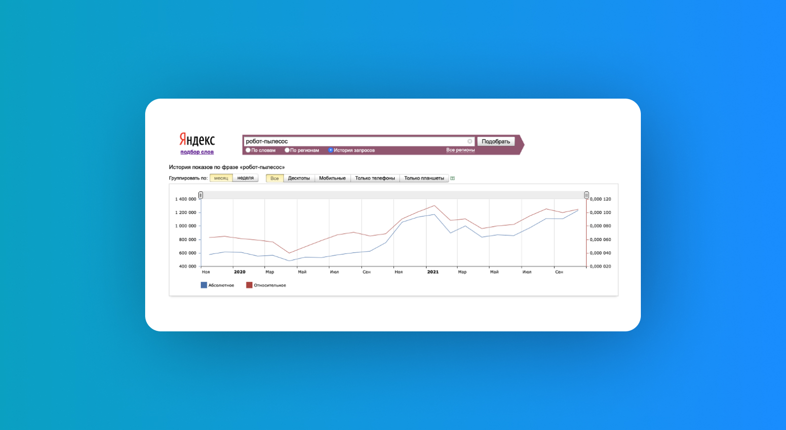 Статистика показывает, что запрос «робот-пылесос» имеет положительную динамику по частоте поиска в течение 2021 года. Источник: Яндекс.Wordstat